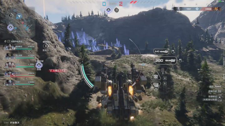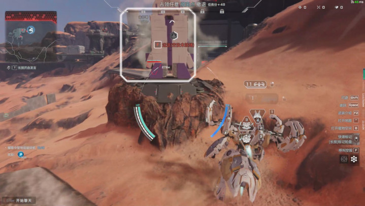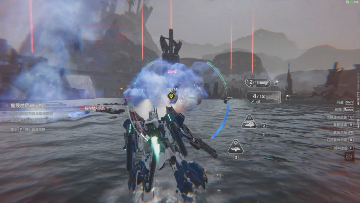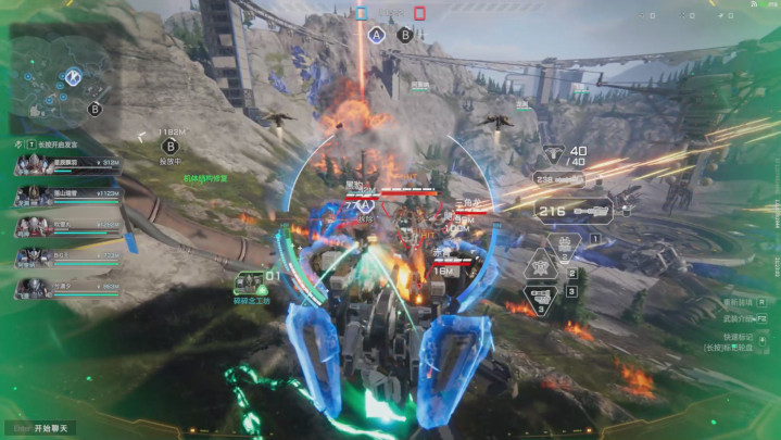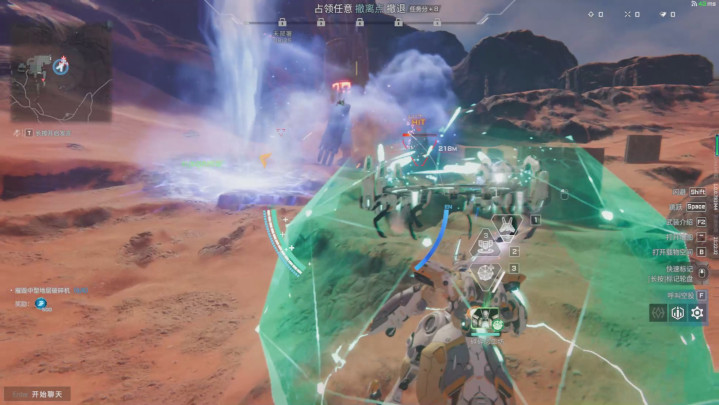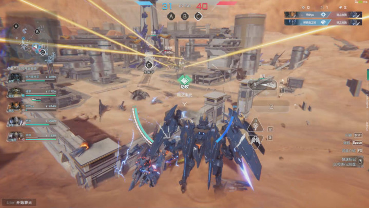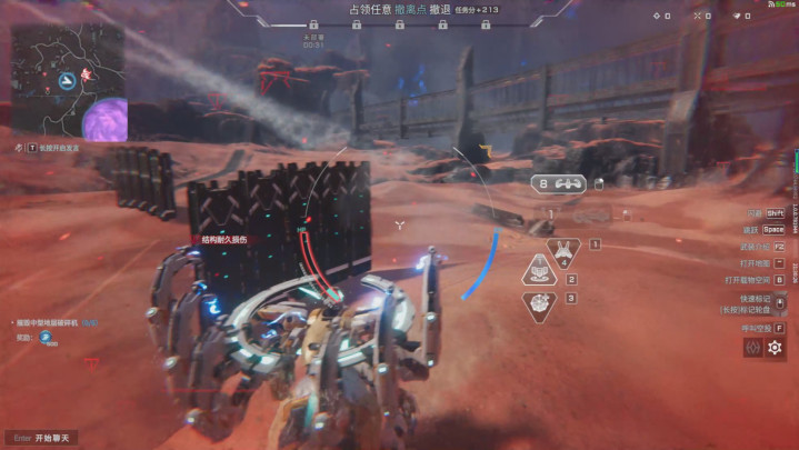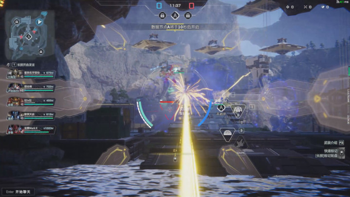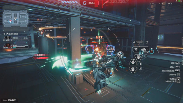 没错,以上故事背景都被西山居特地做进了单机体验模式,相当于准备了一个特别的新手教程,玩家可以一边欣赏剧情一边从中学习解限机的操作方法。事实上本作的玩法并不难上手,如果玩过《永劫无间》、《守望先锋》等动作对战网游的朋友,应该能很快理解它的大部分基本要素。玩家只需要记住,自己是一个机甲操作员,你的机体可以加速冲刺可以闪避敌人攻击可以飞山越岭,但是必须注意引擎能量的消耗与回复。你的机体拥有各种技能和武器库,但是无论什么装备都有着弹药消耗和冷却时间,应该根据战局需要切换使用。而且因为攻击锁定功能的存在,即便是对于动作ACT苦手的玩家,或者是玩射击FPS对枪法不自信的玩家,也可以完全放下对于操作门槛的顾虑,充分参与和享受机甲混战的乐趣。