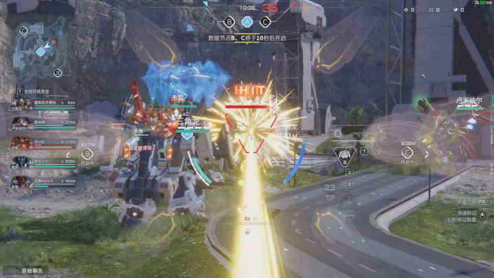 让我特别想要点赞的是,解限机作为一款动作类对战网游,在操作感方面可以说出乎意料的棒,不同吨位机体在移动时有着微妙却明显的手感差别,无论是近战的时候武器互砍,或是拉开距离的炮火连续轰炸输出,都有着强烈金属质感的打击反馈,即便是难以明显展现射击反馈感的超远距离狙击,也同样会给出HIT的命中字样提示,让枪林弹雨无处不在的机甲对抗变得更有灵魂。