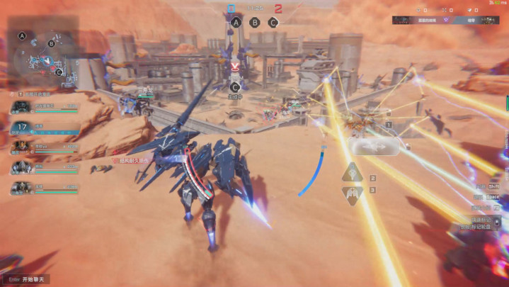 目前解限机一共拥有三种游戏模式。第一个模式《王牌序列》,相当于三对三的小型组队对抗,没有额外的限制和任务,你要做的事情非常简单,就是跟队友一起与对手的队伍在地图里进行对决,一次被击坠并不直接决定比赛的胜负,你可以在短暂休整之后重返战场,并且允许中途更换机体,率先达成击坠指标的一方即为胜利者。